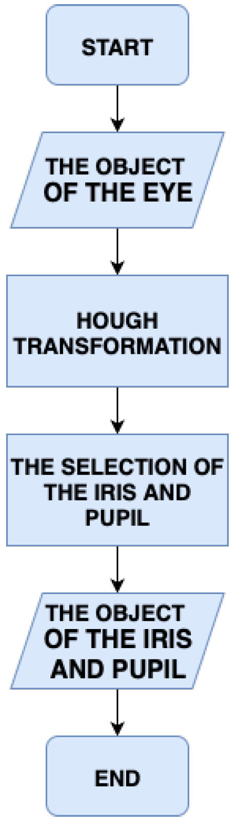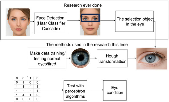 Eye strain detection using Hough transformation helps control PC usage. The system combines a Haar cascade classifier to detect eyes, the Hough transformation to locate the iris and pupil, and an artificial neural network (ANN) to analyze eye conditions [17]. Hough transformation is key for selecting pupil and iris areas in normal and eye strain data. The system workflow is shown in Figure 2.