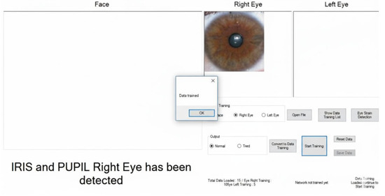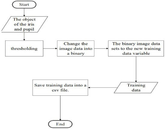Training data is created by thresholding the iris and pupil images to convert them into binary values to be input into the neural network. The data is categorized as detected, fault detected, or not detected, and saved in Excel for retraining to improve accuracy. The training data consists of normal and eye strain categories, where eye strain is indicated by a dilation in the pupil–iris distance due to increased light sensitivity [18]. The training data process is shown in Figure 4.