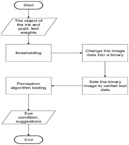 The resulting outputs of the perceptron algorithm are calculations for testing the eye condition data along with a suggestion for the use of a PC. The eye condition detection process can be carried out after the user employs the neural network training perceptron.