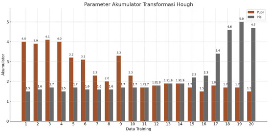 This image shows a graph of the accumulator parameters for irises and pupils in the training data. The graph illustrates that the larger the accumulator value, the smaller the resulting selection area, as shown in Figure 6.