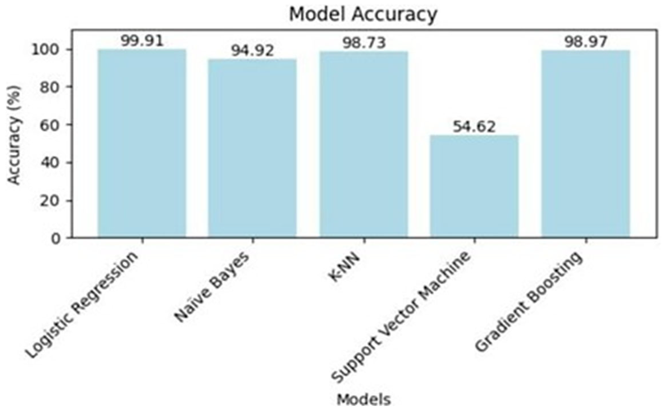 18]. The dataset is split into 80% for training and 20% for testing. The five machine learning models applied include LG, NB, K-NN, SVM, and GB.