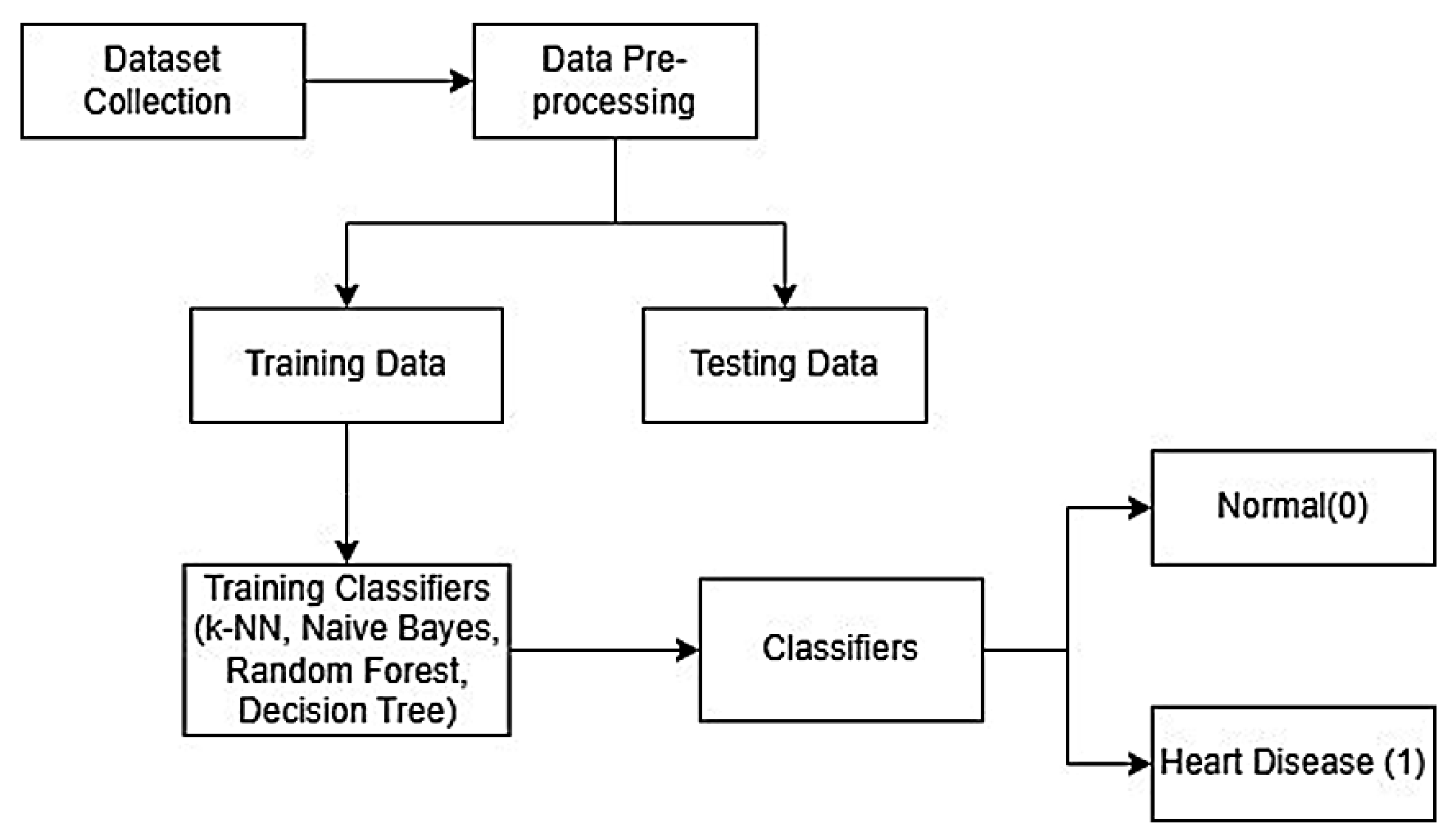 - Model Training: The preprocessed dataset is trained on four machine learning models (KNN, Random Forest, Decision Tree, and Naive Bayes).