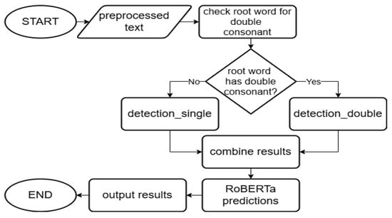 In the model development stage, the Damerau-Levenshtein Distance (DLD) algorithm detects misspellings of melting words in the preprocessed news text, while the RoBERTa model predicts synonyms for those incorrect words. Figure 3 illustrates the overall model development flow, starting with the input of preprocessed text. The system first checks whether the root word contains a double consonant, directing it to either single or double consonant detection accordingly. The results are then combined and processed through the RoBERTa model to generate final predictions before producing the output.