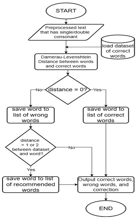 This research aims to improve U-Tapis by enhancing its capacity to identify and correct melting word errors, focusing on both single and double consonant root word cases using NLP. This approach has proven effective in correcting misspelled words in documents and assisting typists by providing helpful tools []. The proposed approach integrates the Damerau-Levenshtein Distance algorithm and the RoBERTa model. The Damerau-Levenshtein Distance algorithm was chosen for its ability to compute the distance between target and source strings, considering adjacent symbol transpositions, making it suitable for building spell-checking systems []. It compares detected words against a dictionary of correct forms and uses the computed distance as the basis for correction. Meanwhile, the RoBERTa model was selected for its superior performance compared to BERT, as RoBERTa is trained on a larger corpus and achieves accuracy in the range of 85–86%, whereas BERT achieves accuracy in the range of 83–85% [].