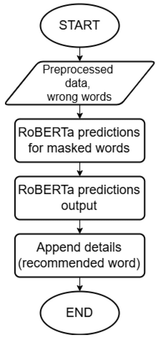 To build the synonym prediction mechanism, the pre-trained transformer model “cahya/roberta-base-indonesian-1.5G” from HuggingFace is utilized []. Incorrect words in the list of wrong words are masked using the “<mask>” format before being input into the model. The preprocessed text and the masked words serve as the basis for the model to predict synonyms as word recommendations. These prediction results are appended to the detailed output, so the final output of the model comprises the detected incorrect words, their corrections, and the corresponding word recommendations. This process is illustrated in Figure 5.