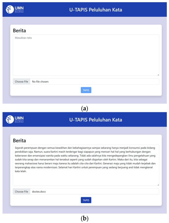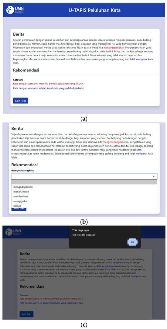 After the user presses the “Tapis” button, the system will process the news and display the news text along with the detection results, as shown in Figure 7. The red color indicates that the detected word has an incorrect melting word form according to the Kamus Besar Bahasa Indonesia (The Indonesian Language Dictionary) and the blue color indicates that the previously incorrect word has been replaced with the system’s corrected version. If a red-colored word, which indicates an incorrect melting word form, is clicked, the user can press the dropdown menu to view a list of suggested corrections and recommendations for the word. This feature allows users to evaluate the provided suggestions, reducing the risk of blindly accepting corrections without ensuring their accuracy and relevance. The user can select one of the correction and recommendation options provided by the system. After the user selects one of the correction options, the incorrect word will automatically be replaced with the selected option. The corrected text can be copied by clicking the “Salin Teks” (Copy Text) button. Once the text is successfully copied, the system displays an alert confirming the completion of the process.