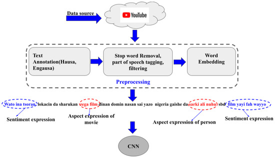 Dataset collection was carried out using web scraping with Python 3.7, which facilitated the gathering of numerous Hausa comments from YouTube channels. Subsequently, the dataset underwent preprocessing, involving the removal of instances that did not capture any of the aspect categories and the removal of stopwords—words that typically contribute less meaning to a text, such as ’a,’ ’ni,’ ’to,’ ’su,’an’. Additionally, irrelevant terms, such as emojis, usernames, special characters (@, #), punctuation marks, and numbers, were also removed. Furthermore, the texts were converted to lowercase. Finally, comments and aspect words were vectorized using Term Frequency Inverse Document Frequency (TF-IDF), which is one of the most straightforward and effective ways to comprehend the context of a document and locate relevant information and key terms and phrases.