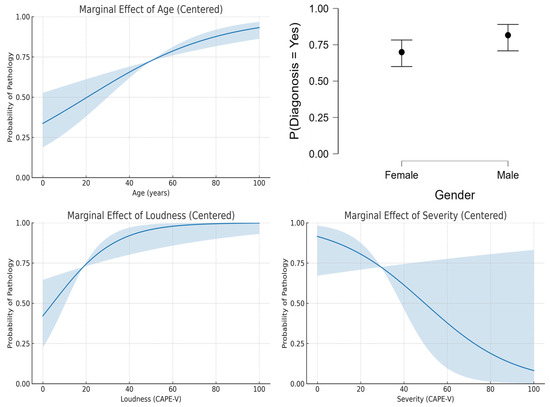 The logistic regression analysis of the dataset provided insights into the influence of age, gender, loudness, and severity on the probability of voice pathology diagnosis. Figure 2 shows the results that indicate that age exhibited a positive linear relationship with the likelihood of diagnosis, with older individuals being at higher risk (Figure 2, top-left). This aligns with the general understanding that aging is a risk factor for many voice disorders due to degenerative changes in the vocal folds. Nevertheless, this pattern may not generalize to datasets focusing on pediatric populations or those with specific non-age-related pathologies.