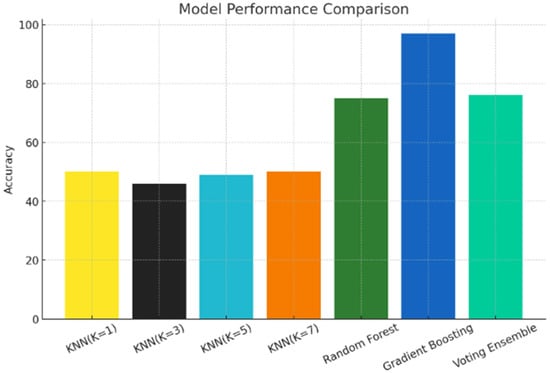 The analysis evaluates a range of parameters for each of the models investigated, including accuracy, precision and recall. The results showed that Gradient Boosting and Random Forest outperformed the other models, showing their ability to deal with non-linear relationships and feature interactions. KNN also scored well but was still susceptible to noisy input. Figure 1 shows the accuracy values visualization.