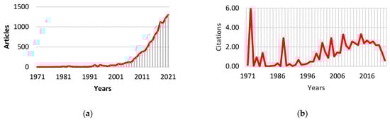 Figure 2b illustrates citations per year, which shows a fluctuating citation trend from 1971 to 2021. A sharp spike in citations occurred around 1976 with an average number of 297 citations per article, or about 6.06 citations per year, and only one article. This indicates that the work became an important work that attracted great attention from all publishers. After this peak, there is a general trend of sporadic citations, with notable increases in certain years but without a clear and sustained upward trajectory.