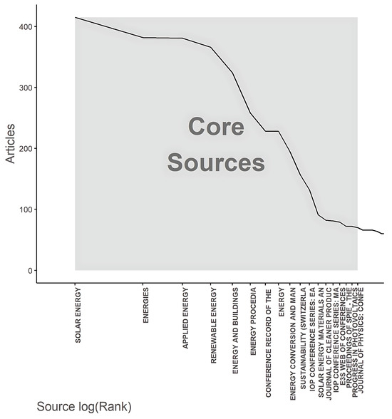 In this diagram, we can see that the shaded portion of “Core Sources” is at the beginning of the curve, indicating that most articles in this field are concentrated in the top few journals, such as “Solar Energy,” “Energies,” and “Applied Energy.” This is in accordance with the principle of Bradford’s Law, where the core zone, or “Zone 1”, includes journals that produce most of the significant and relevant articles in the field.