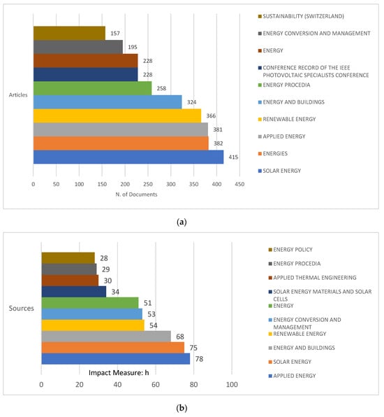 Figure 4b) shows an evaluation of the local impact of various sources in the field of renewable energy using the H-index. The H-index is a metric that measures the productivity and citation impact of works published in a journal. The index is calculated based on the number of publications (N) in a journal that each receives at least N citations, thus identifying journals that have significant influence in a particular research community.