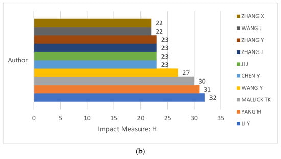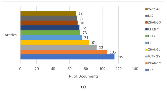 Figure 5a shows authors based on the number of documents they have published. Leading authors in a field often shape the landscape of research and innovation. For example, figures such as “LI Y” with 115 publications and “ZHANG Y” with 106 publications stand out as key contributors. Their significant publication history not only demonstrates their productivity but also positions them as authorities who tend to advance key topics in their domain, making them figures of interest to anyone studying or involved in current developments.