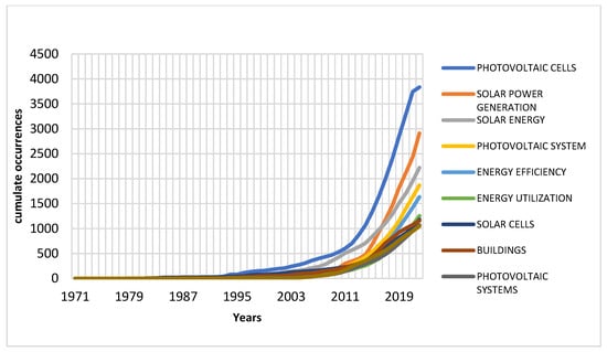 Trend analysis of BIPV research shows that terms such as “building” and “architectural design” have shown a steady frequency over time, reflecting consistent interest. However, the rate of growth is slower than that of energy-focused terms, indicating that while architectural integration remains significant, it is in a secondary position compared to the dominant theme of energy production.