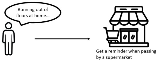 One notices that they have run out of a product they have at home. They may need to purchase some more, but the problem does not require any immediate solution as sketched in Figure 2. However, it would be nice to be reminded while visiting a nearby food store.