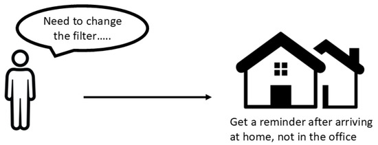 A homemaker needs to change the water filter as soon as possible (not necessarily at a strictly defined moment in time). This task can only be accomplished at home, so it would be helpful if the reminder appears only while at home and at an appropriate moment of time, for example, not during the nighttime or too early in the morning. Figure 3 depicts the case.