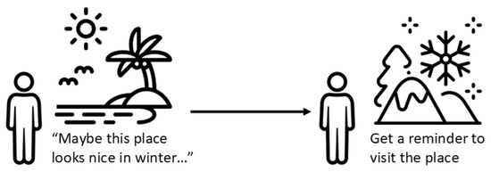 A traveler discovers an interesting but not-so-famous sightseeing spot that would be great to visit at a different moment in time (for instance, during a better season) as diagrammed in Figure 4. The exact time when this traveler can come back to the area cannot be determined yet, but it would be helpful to receive a reminder about this place if it happens that one day the traveler is around the area again.