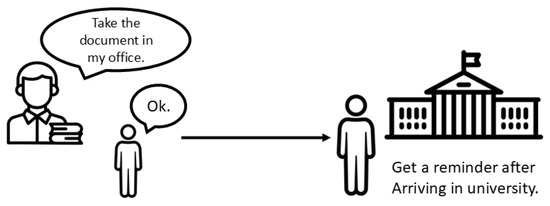 A student requests a document from the research supervisor that needs to be submitted to the student affairs office. The supervisor left the document on his office door so the student could take it anytime. There is no urgency, but in order not to forget about the duty prior to the due date, a reminder might be helpful when the student goes to attend class at the nearest location on campus. Figure 6 draws on this use case.