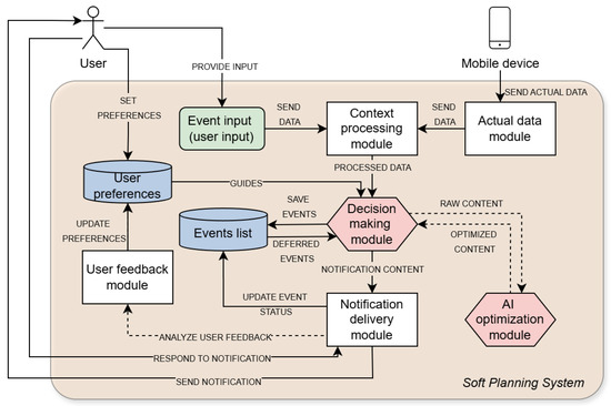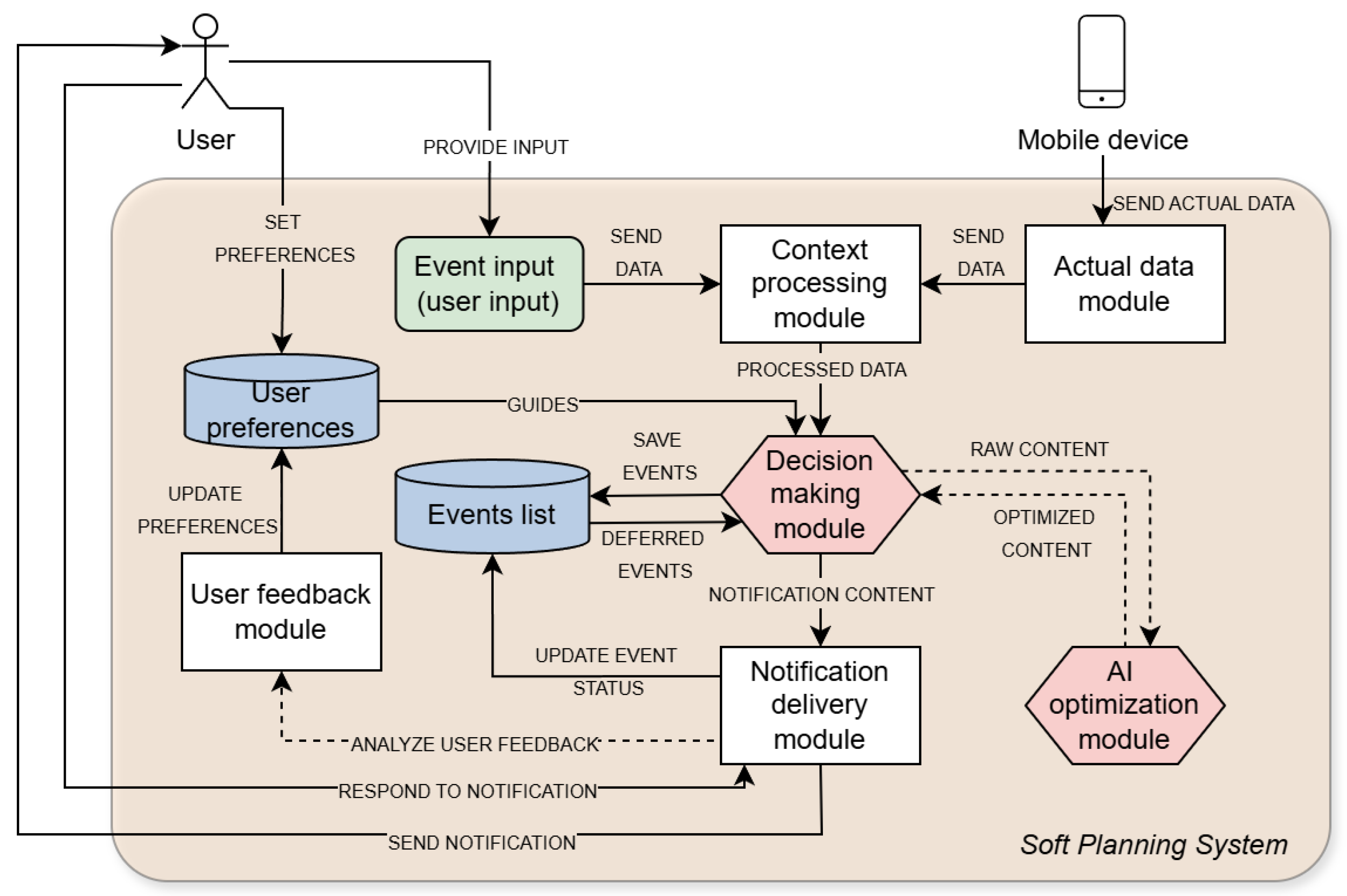 Figure 12 presents a simplified system structure illustrating how soft planning, adaptive notifications, and AI agents can be integrated into a functional system. The modules are aimed at facilitating adaptive notifications based on user input and actual data.