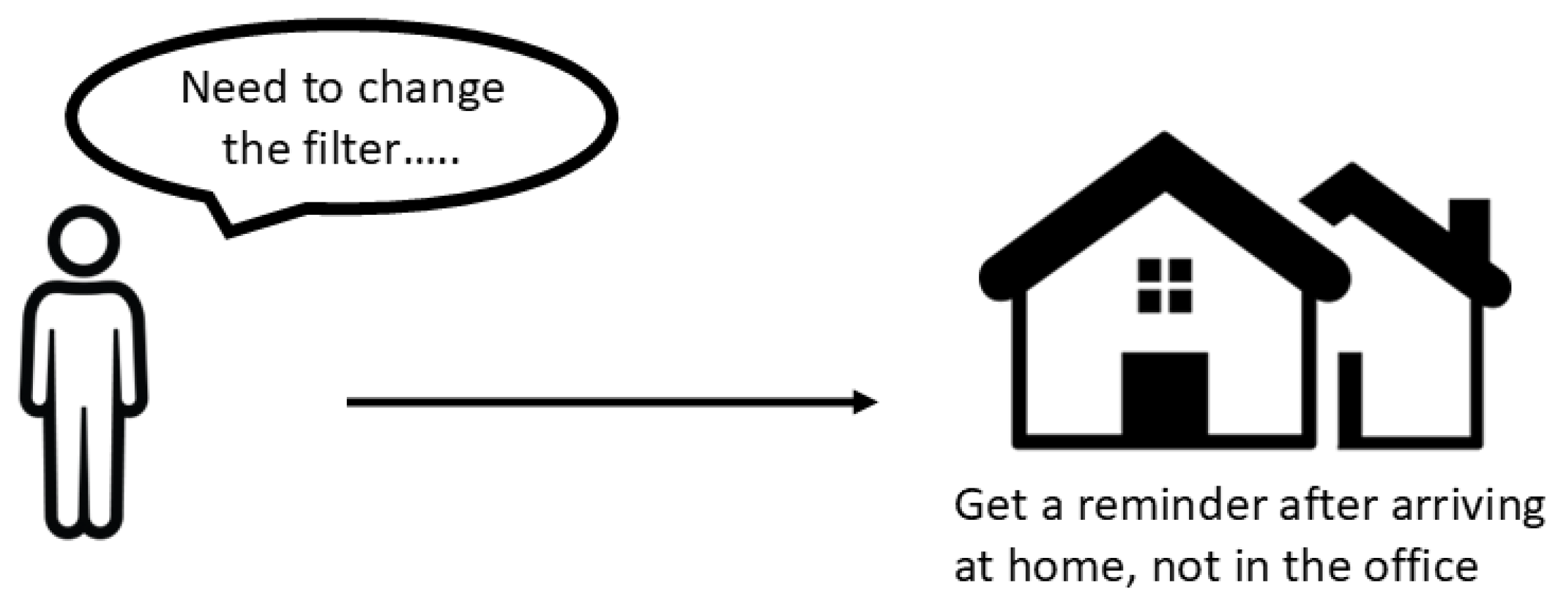 A homemaker needs to change the water filter as soon as possible (not necessarily at a strictly defined moment in time). This task can only be accomplished at home, so it would be helpful if the reminder appears only while at home and at an appropriate moment of time, for example, not during the nighttime or too early in the morning.