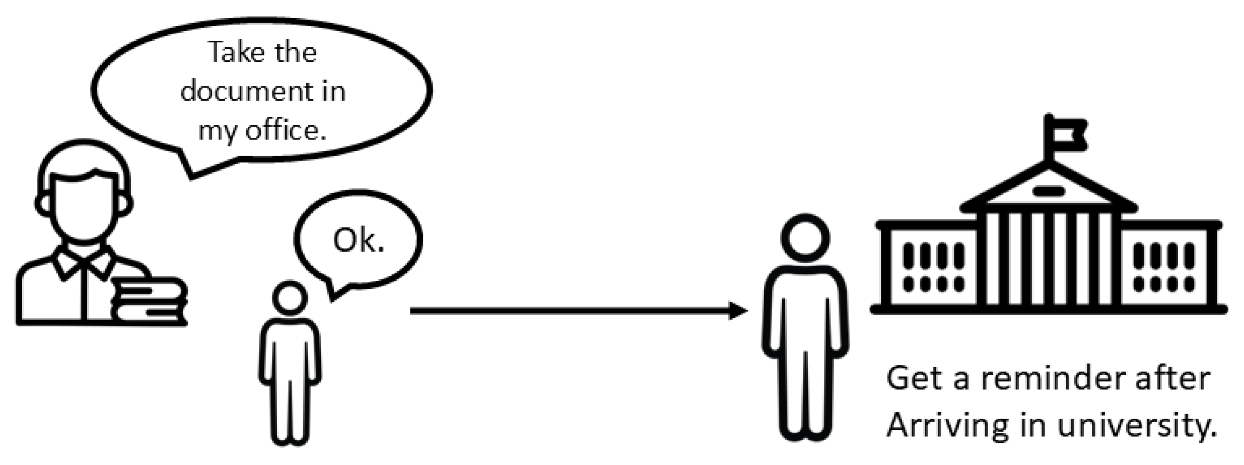 A student requests a document from the research supervisor that needs to be submitted to the student affairs office. The supervisor left the document on his office door so the student could take it anytime. There is no urgency, but in order not to forget about the duty prior to the due date, a reminder might be helpful when the student goes to attend class at the nearest location on campus.