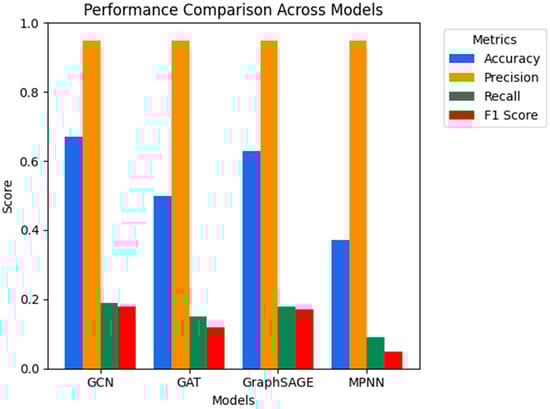 Each model was adapted to ensure it predicts DDIs more efficiently. Graph convolutional networks employed spectral convolutions that merge features from adjacent nodes to focus on local interactions. GATs have attention mechanisms, allowing them to assign weights to edges and hence make this particular model concentrate only on vital drug interactions. GraphSAGE used inductive learning, where the features were sampled and aggregated by a node’s neighbors, making it a good performer for large graphs. MPNNs had message-passing layers in which nodes exchange information iteratively with their neighbor, enabling the model to capture both direct and indirect interactions. These designs were aimed at effectively modeling the different complexities of DDIs. These designs were aimed at effectively modeling the different complexities of DDIs, as illustrated in Figure 4, which provides a visualization of the drug interaction graph. Figure 5, demonstrates GCN performs better than MPNN on accuracy metrics.