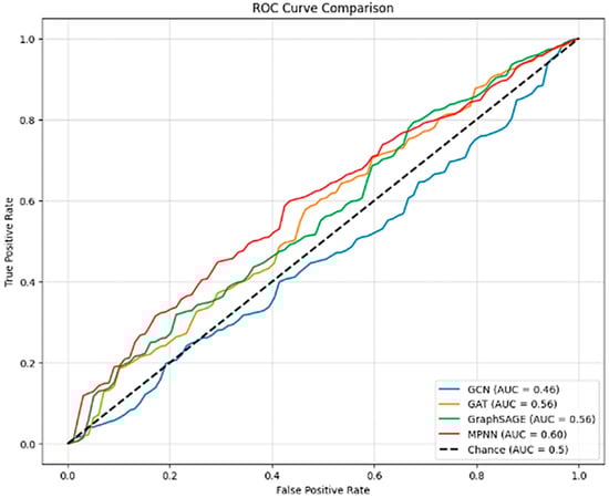 To measure the quality of the models, various evaluation metrics were used including AUC(Area Under The Curve), F1 score, recall, precision, and accuracy. GraphSAGE was found to be the best among these models with an accuracy of 61.04%, F1 score of 44.89%, and AUC of 56%. ROC curves for each model revealed their ability to differentiate between interacting drug pairs from non-interacting ones. GCNs and GATs performed well but lagged behind GraphSAGE in dealing with large complex graphs. MPNNs, on the other hand, were expressive but computationally expensive and prone to overfitting. Comparing these models highlighted their strengths and weaknesses. The fact that GraphSAGE is scalable and able to generalize well on unseen data made it a good choice for this experiment. On the other hand, GATs come with additional interpretability through attention mechanisms at the cost of higher computation resources as compared to others such as GCNs, which are faster but not very effective when capturing indirect interactions. These findings led to adopting GraphSAGE as the main architecture for our final model, taking into account both performance, scaling ability, and computational time efficiency involved during the implementation stage.