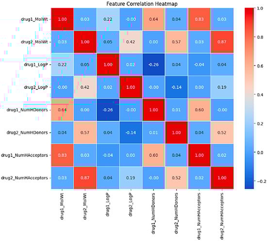 Results as shown in Figure 6, without hyperparameter tuning demonstrate the initial performance of the graph neural network (GNN) models—GCN, GAT, GraphSAGE, and MPNN—through metrics including accuracy, precision, recall, and F1 score. These were computed for each model’s performance measurement. Accuracy: By achieving the highest accuracy, the GCN (65.85%) outperformed GAT (49.86%), GraphSAGE (61.04%), and MPNN (37.66%). In other words, this suggests that the GCN is able to effectively capture drug interaction patterns even without any modifications in its default configuration. Precision: All models had high precision values, with GCN having 91.25%, GAT having 92.57%, GraphSAGE having 89.57%, and MPNN having 92.12%, meaning they can minimize false positives. Recall: It was hard to find ‘true positive’ interactions, because recall values were significantly low. The GCN had the highest recall (18.82%), while the MPNN had the lowest (6.25%). F1 Score: The overall model performance for all models measured by the F1 score, which is a combination of precision and recall in terms of accuracy, was relatively poor, with the GCN showing the highest at 17.84%. This reflects that imbalanced datasets pose difficulties when it comes to accurate predictions of interactions. As shown in Figure 7, the drug interaction prediction model provides interactive results, including the confidence score and severity of the potential interaction. The comparison of pre-tuning and post-tuning results for GCN, GAT, GraphSAGE, and MPNN models is presented in Table 2. The inter-feature dependencies are visualized in the correlation heatmap (Figure 8).