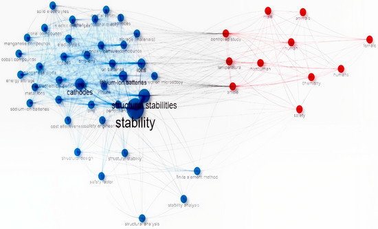 The image above shows a keyword network with two main groups. The first group (blue) focuses on material technology, especially lithium-ion batteries and structural stability, highlighting terms like “stability,” “cathodes,” and “finite element method.” The second group (red) relates to safety and biological impacts, featuring terms like “safety,” “humans,” and “temperature,” reflecting experimental studies on material effects on health and the environment. The groups are linked by terms like “safety” and “temperature,” showing the connection between material engineering and biological safety. Stability is crucial for durability and performance, particularly in lithium-ion batteries, in which unstable materials can lead to degradation and hazards.