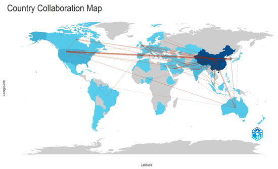 The figure shows that China emerges as the dominant contributor, both in publication volume (indicated by the darkest blue shade) and as the central hub of international cooperation. China demonstrates strong collaborative links with the United States, several European countries, Australia, and other Asian nations, underscoring its pivotal role in shaping global research directions.