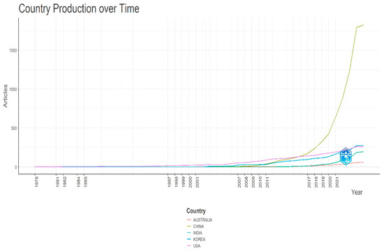 In the initial dataset of 898 documents, the network map revealed a vast network of collaboration. China has become a major hub, with a dense network of connections with countries around the world. Key partnerships include ties with the United States, Norway, and Italy. These relationships underscore China’s role as a global research center for work, for example, on seawater-impacted road infrastructure, one encouraging diverse and deep cooperation. With the data reduced to 130 documents, the collaboration network has become more focused, with an emphasis on impactful and sustainable partnerships. The United States takes center stage, with notable collaborations with China and European countries such as Austria. In the final dataset of 47 documents, the network is refined into the strongest and most specialized partnerships. China leads, with a focus on close cooperation with smaller but significant influences, especially with respect to Norway and the United States. The reductions incorporated in this network analysis demonstrate the prioritization of existing research reports aimed at addressing advanced issues on the safety and balance of earthquake-affected structures. The following graph, Figure 5, shows the countries that have produced articles on the safety and balance of structures affected by major earthquakes and floods. Annual article production by country is presented in Figure 5.