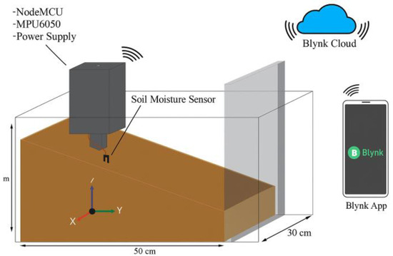 In this research, the system was designed to be able to read the soil slope and moisture using MPU6050 sensors (Invensense Inc., San Jose, CA, USA) and a capacitive soil moisture sensor (DFRobot, Shanghai, China) connected to microcontrollers (Espressif Systems, Shanghai, China). MPU6050 is a sensor module that has two functions in it, namely, an accelerometer with a micro-electromechanical system (MEMS) and a gyroscope with a micro-electromechanical system (MEMS) in a chip. A capacitive soil moisture sensor is a sensor that can detect the intensity of water in the soil (moisture). The output of the system contains data on the soil slope of the X-axis and soil moisture displayed in the Blynk application. Microcontrollers transmit data using WiFi, which is then uploaded to the Blynk Cloud and forwarded to the dashboard contained in the Blynk app (Version 1.2.0). The general overview of this research is shown in Figure 1.