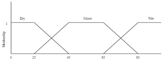 Soil Moisture Membership Function. The applied soil moisture classification of sensors and algorithms is made with a range of values, such as those in Table 3.