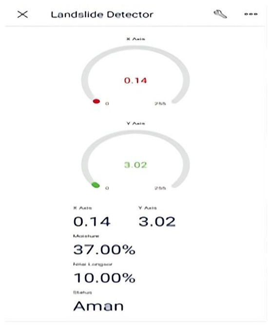 Tests that were performed obtained results from devices that were designed, and data transmitted by microcontrollers was received in the Blynk app. The data displayed on the Blynk App was recorded every 15 s, 20 times, during ground movement. Data was recorded manually based on the data displayed on the Blynk app, as shown in Figure 8.