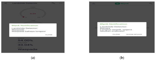 The results of our study highlight the effectiveness of the proposed multi-sensor early warning system with a fuzzy logic method based on IoT technology. By leveraging a combination of sensor data fusion, fuzzy logic reasoning, and internet connectivity, the system offers a comprehensive solution for landslide monitoring and risk assessment. The integration with the Blynk application enhances the system’s accessibility and usability, enabling users to receive actionable information and respond promptly to potential landslide threats. Even though the device can detect landslide movement based on soil moisture, it has not been optimal in detecting soil movement. Meanwhile, the warning system in this research can also send data well to Android by using the Blynk app, which can display the state of the ground data.