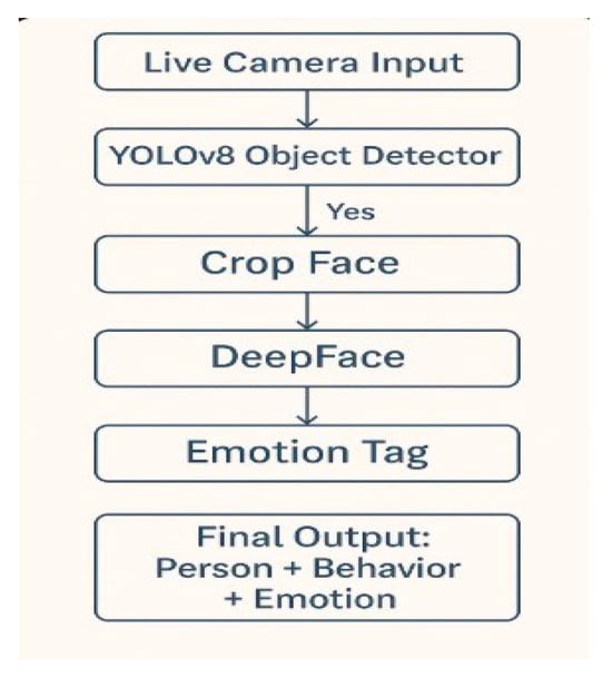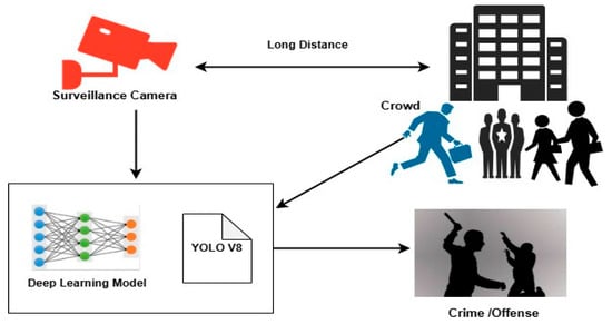 Figure 1 shows a high-level architecture that uses surveillance cameras and deep learning models to detect suspicious activity. To identify objects, a deep learning system is trained using data from security cameras (YOLOv8). This model looks at scenarios like large crowds, long distances, or solitary activities to identify potential threats or crimes. The technology facilitates real-time criminal monitoring and response by aiding in the detection of anomalous activities like theft or assault. That need is satisfied by this work, which creates a deep learning-based intelligent monitoring system that can quickly spot anomalies. To detect strange human behavior, the technology analyzes irregular movement patterns and detects dubious emotional expressions using advanced models such as YOLOv8 for object detection and DeepFace for facial emotion analysis. Compared to conventional methods, this approach increases threat identification speed and accuracy by automating the analysis of surveillance footage. By combining motion tracking, computer vision, and facial expression analysis, the proposed system aims to provide a comprehensive security solution. By offering workable solutions for implementing more intelligent and flexible security systems, the methods and data presented in this study support the expanding field of artificial intelligence-powered supervision.