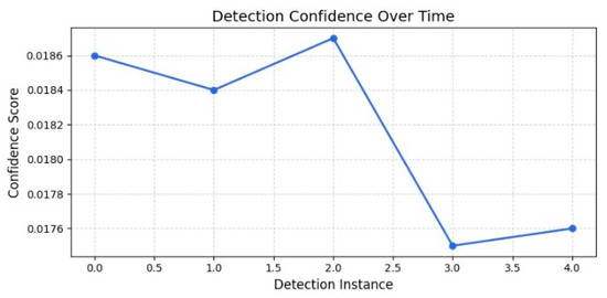 Two distinct peaks can be seen in the detection confidence score distribution, suggesting that while the model is confident in its predictions, there is some variation amongst instances. Figure 3 shows the variations in the scatter plot of detection confidence over time, with some cases showing a lower confidence score (0.75). These variations may be primarily caused by modifications to the surrounding environment, including occlusion or lighting, as well as model instability in differentiating between similar patterns. The detection quality is impacted by motion blur. Figure 4 illustrates that detection confidence remains fairly stable, with a small rise at instance 2, followed by a noticeable dip at instance 3 before leveling out.