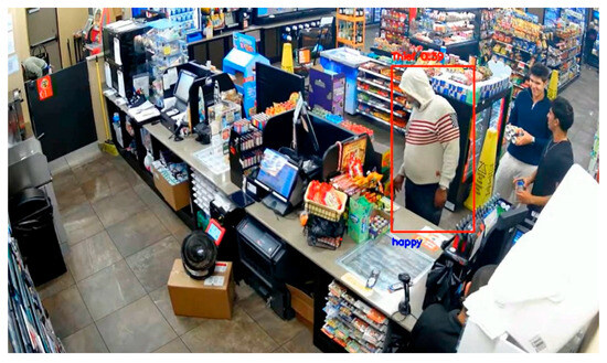 An example of object detection and emotion categorization in a retail surveillance frame.