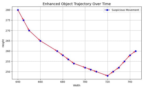 The trajectory visualization exhibits irregular movement patterns, characterized by frequent turns and unpredictable paths. The chaotic movement suggests potential suspicious behavior, such as surveillance avoidance, where the subject intentionally moves unpredictably; hesitation or reconnaissance before engaging in unlawful activity; and background interference causing tracking noise. The Figure 7 shows the enhanced trajectory of a moving object, where blue markers indicate points of suspicious movement. The pattern highlights a downward motion followed by a gradual rise, demonstrating how the system effectively tracks irregular object behavior over time.