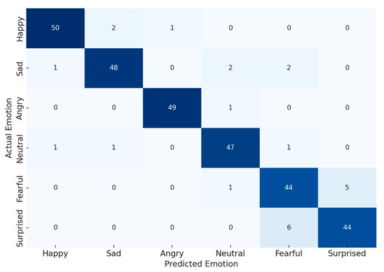 Figure 8 presents the confusion matrix, clearly highlighting confusion between certain emotional states, aiding in future model calibration and dataset augmentation. The darker blue cells indicate higher correct classification rates, while lighter blue cells represent fewer instances or misclassifications.
