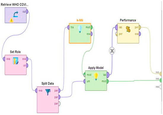 Table 2 summarizes the evaluation for each model. SVM achieved the highest accuracy at 87.00%, logistic regression, KNN performed quite well. Still, these results suggest areas for improvement, specifically with regard to sensitivity and false positive detection. The workflow for applying the K-Nearest Neighbors (KNN) model using RapidMiner is illustrated in Figure 1.