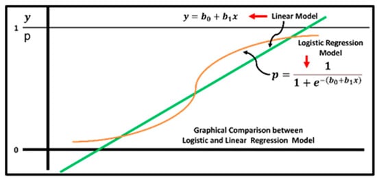 - Logistic Regression (LR): Logistic regression is a traditional linear model that is applied to tasks involving binary classification [28]. The model calculates the likelihood that a transaction is fraudulent by analyzing its input data. LR is a statistical approach for simulating the chance that an input will fall into a certain class in binary classification. It represents the input for the various probabilities of 0,1 using the LR, commonly known as the sigmoid function. Logistic regression is different from linear regression, as shown in Figure 2.