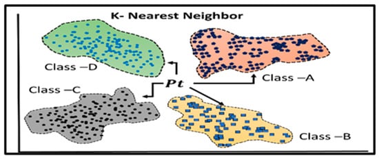 Figure 2. A comparison between linear and logistic regression models. Linear regression models the connection between a dependent variable and one or more independent variables. - K-Nearest Neighbor (KNN): KNN is a popular machine learning technique for classification and regression applications. The basic notion underlying KNN is that related data points will have similar labels or values, as shown in Figure 3. During the training phase, KNN does not generate an explicit model but saves the complete training dataset. During the process of generating predictions, the method makes use of a particular distance metric, such as the Manhattan distance or the Euclidean distance, to determine the distance that exists between each point in the training dataset and the input data. After that, the method locates the ‘k’ places that are closest to the output label or value and then uses those locations to determine the output label or value [23].