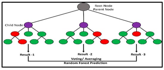 Figure 3. Representation of the K-Nearest Neighbor (KNN) technique, which may be used for classification or regression problems. - Random Forest: Random forests use ensemble learning techniques to boost prediction accuracy and resilience against overfitting by mixing many decision trees, as shown in Figure 4. The technique uses many decision trees to reduce complexity and improve prediction. Every tree in the forest is trained using a random subset of characteristics and a random portion of training data. The outputs of each tree are combined (e.g., by mean regression or voting for classification) to produce the final forecast during prediction. Decision trees are less obtrusive, less flexible, and less resilient than random forests [9].