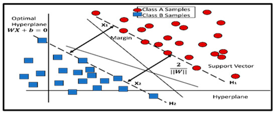 Figure 5. A visualization of a Support Vector Machine (SVM) with an optimal hyperplane, support vectors, and margin. Learning methods that combine multiple decision trees to improve prediction accuracy and avoid overfitting.
