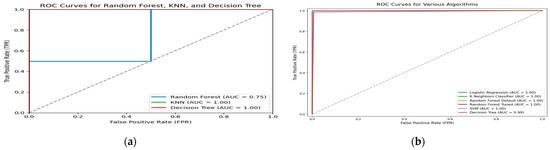 (a). The ROC and AUC show different algorithms: Random Forest, KNN, and Decision Tree. (b). The figure shows different AUC ROC for LR, KNN, RF, SVM, and Decision Tree.