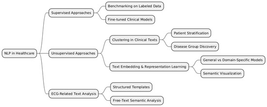 To structure the various methodologies and applications of NLP in healthcare, we categorize them into supervised, unsupervised, and domain-specific approaches, such as ECG-related text analysis. Figure 2 below provides a visual representation of these categories and their respective subcategories, which will be further discussed in this literature review.