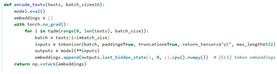 We define a function, encode_texts, to generate embeddings for all the ECG reports. The function splits the data into batches, tokenizes each batch, and passes the tokens through the BioBERT model to obtain the embeddings. These embeddings are extracted from the [CLS] token, which is the representation of the entire sentence in BERT-based models.