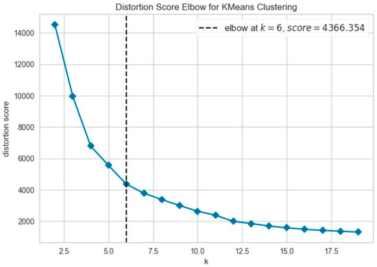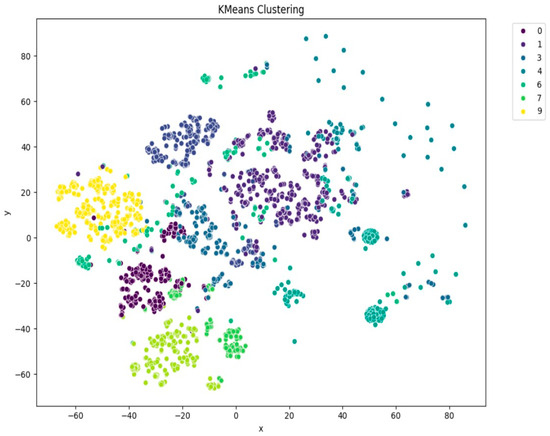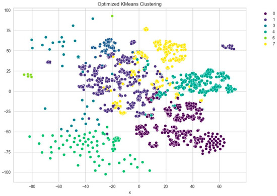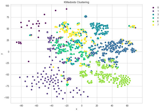 Further evaluation of KMeans clustering was conducted using principal component analysis (PCA) and the elbow method, which suggested an optimal cluster number around 10–11. This was supported by a silhouette score of 0.41 (Figure 8), indicating moderate cohesion and separation between the discovered clusters. A comparison with KMedoids also yielded similar clustering structures, albeit with slightly more compact clusters in certain regions, as can be observed in the t-SNE plots post-PCA (Figure 9). The figure shows that using six clusters provides a good balance between compactness and simplicity in the clustering solution.