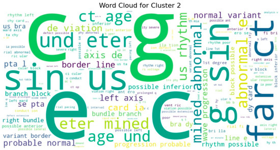 In order to crack the semantic nature of each cluster, we produced word clouds of the most frequent tokens in selected clusters. The word clouds provided an insight into dominant clinical themes or trends in single groups. In certain clusters, for instance, words for rhythm abnormalities were emphasized (e.g., “sinus”, “tachycardia”), while in other clusters, results involving structures or devices (e.g., “paced”, “infarct”) were targeted. This supports the hypothesis that the unsupervised model correctly characterized clinical subtypes or classes entirely based on patterns of text.